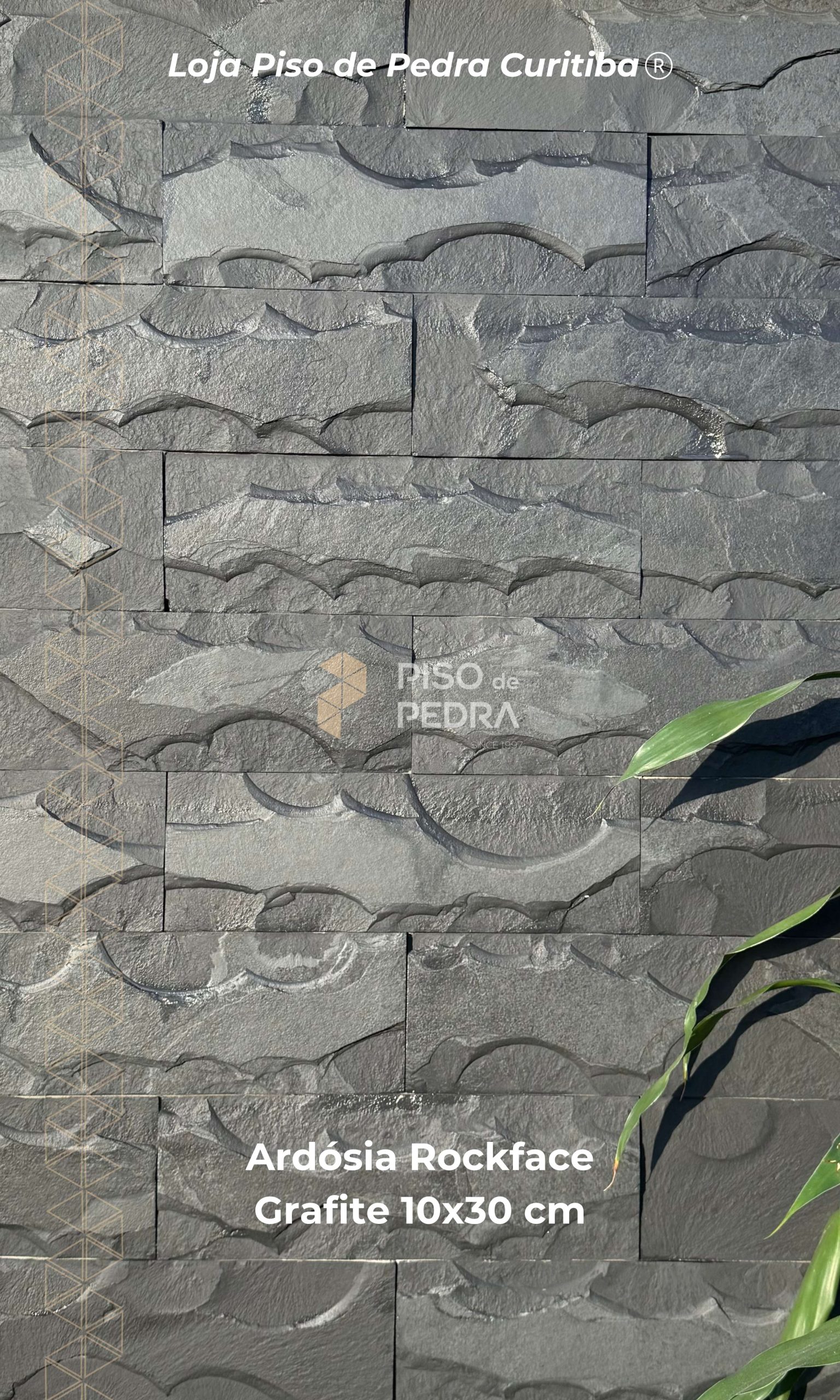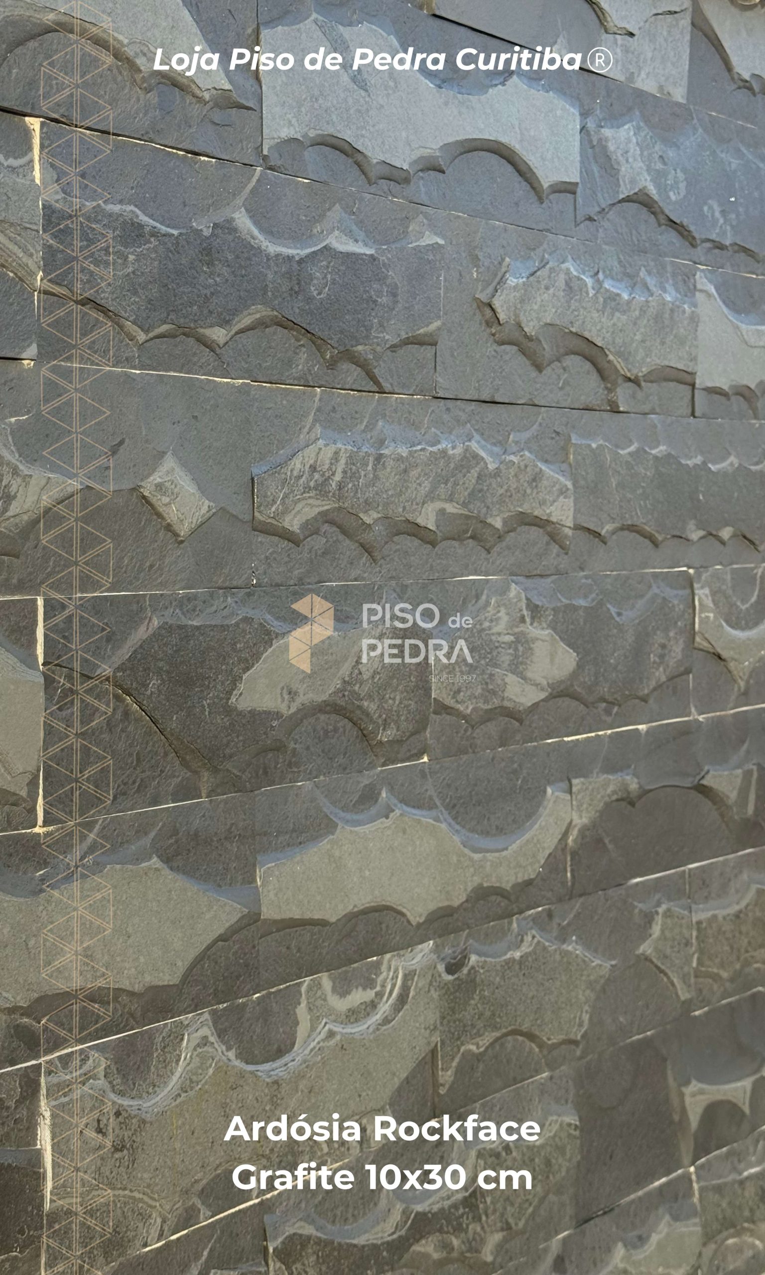 Revestimento Ardósia Rockface 10×30 cm nas cores grafite ou cinza. Ideal para paredes internas e externas, com acabamento almofadado e junta seca. Visual 3D, rústico e sofisticado, com textura natural e durabilidade.